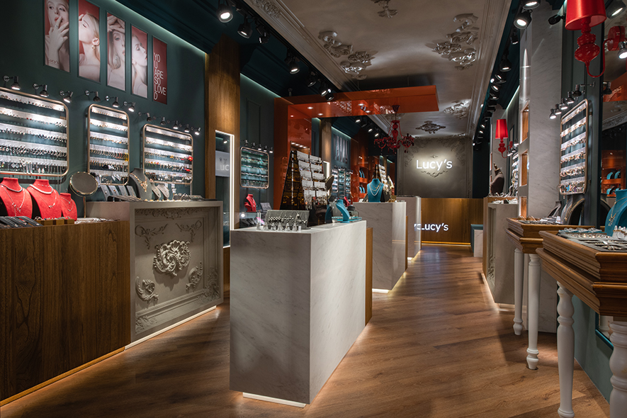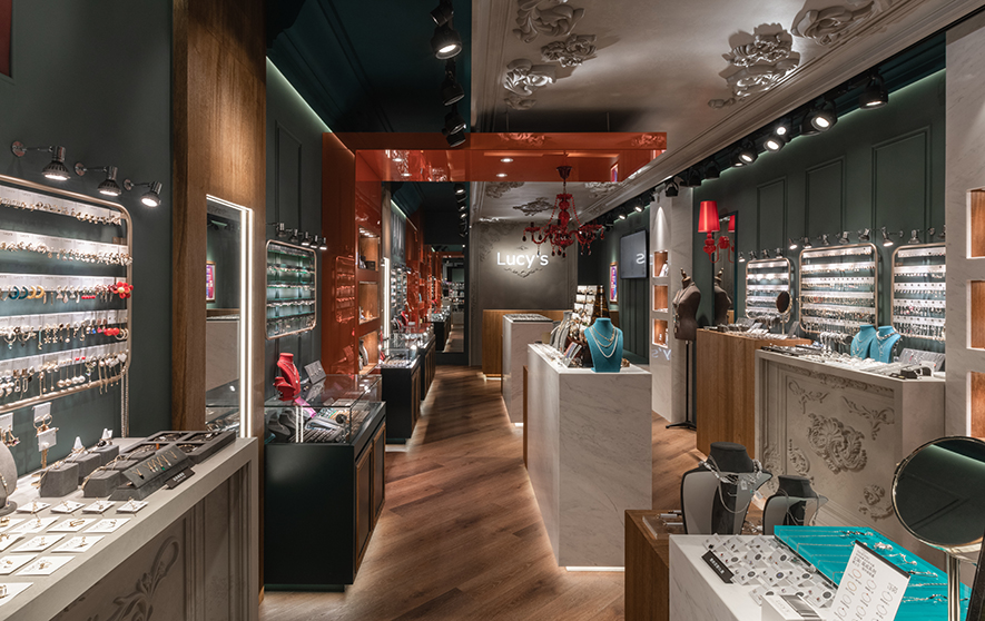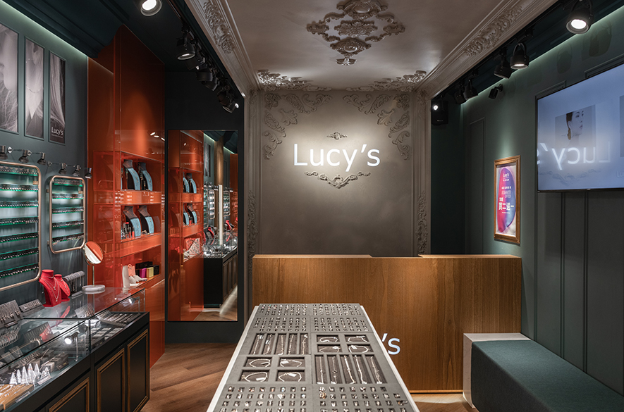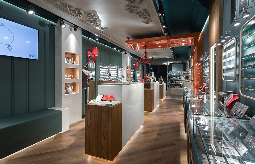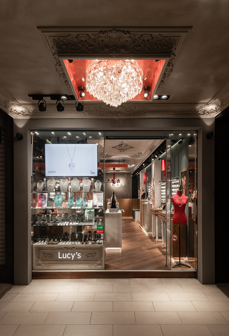 深邃墨綠與溫潤木質交織,而點綴其間的朱紅色彩如珠寶般閃耀,為沉穩基調注入靈動生機;華美的歐式天花浮雕俯瞰著現代陳設,古雅、當代在此優雅對話,下方晶瑩展櫃整齊羅列兩側,將每件飾品托舉成璀璨奪目的藝術品;柔和燈光輕柔流淌,映照出金屬光澤與寶石的璀璨,步入其中彷彿踏進被時光凝結的珍寶閣,在雅逸與精緻的氛圍中,感受飾品背後蘊藏的故事與匠心,沉醉於充滿儀式感的選物體驗中。