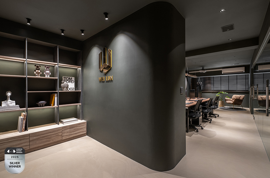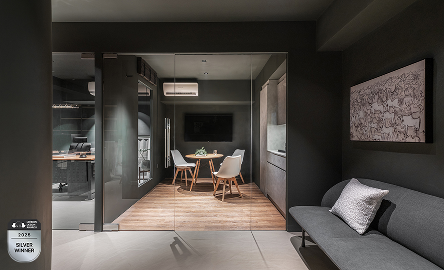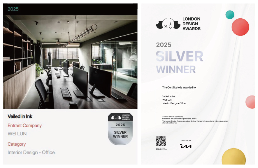 LONDON Design Awards以富含理念的小丑LITO作為獎項形象代表,其由內而外散發不依世俗的個性感,象徵設計不應按照固有框架侷限想像,而是可融合任何審美觀及概念賦予嶄新涵義,藉此鼓勵設計師們擺脫束縛、勇敢創作自己想要的作品。緯綸室內裝修設計有限公司 秉持「融合性美學」理念,於《墨隱》辦公空間中,巧妙運用通透玻璃與深色建材的對比,將單一採光面的限制轉化為光影層次的優勢,創造出兼具視覺深度的工作場域,精準回應本屆賽事中「卓越創新」的核心價值,深獲國際評審賞識,迎來「銀獎」佳績!