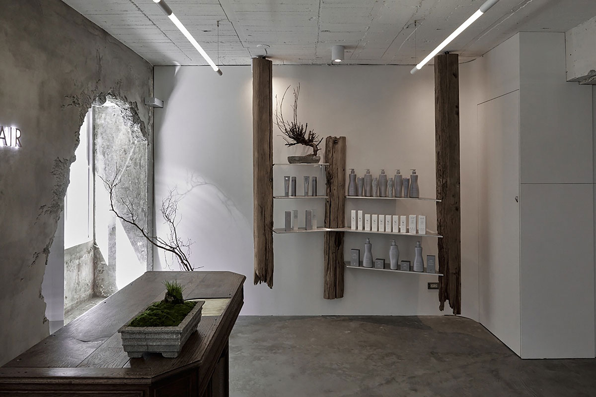 Unlike trendy salons, the owner embraces a grunge style reflecting the brand’s concept. The designer adopts a subtractive approach, preserving existing structures with minimal additions, exposing time’s imprint. Set against plaster surfaces, excavated outlines and time marks reveal their raw character.